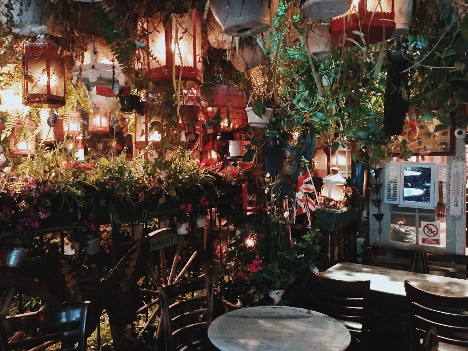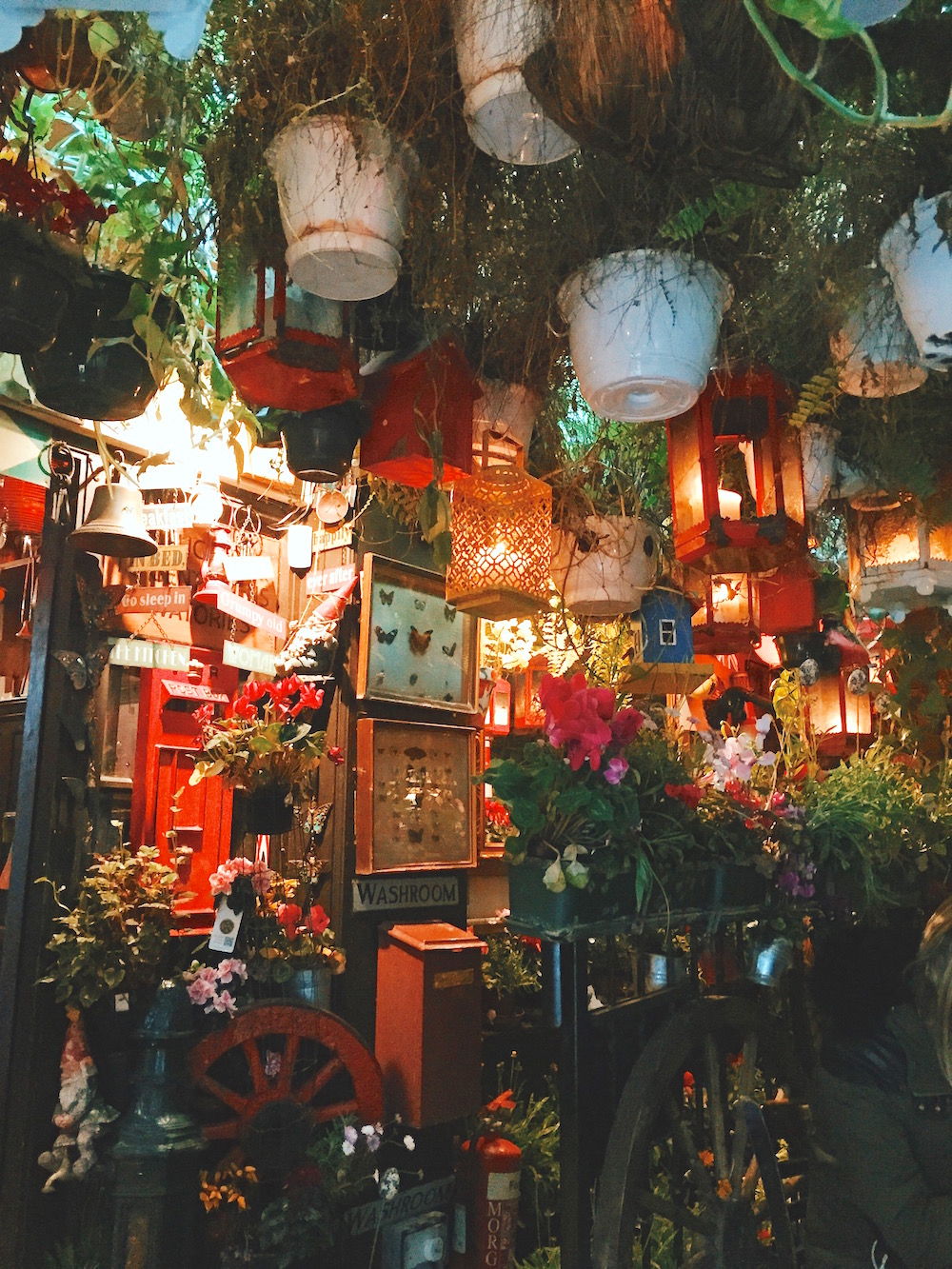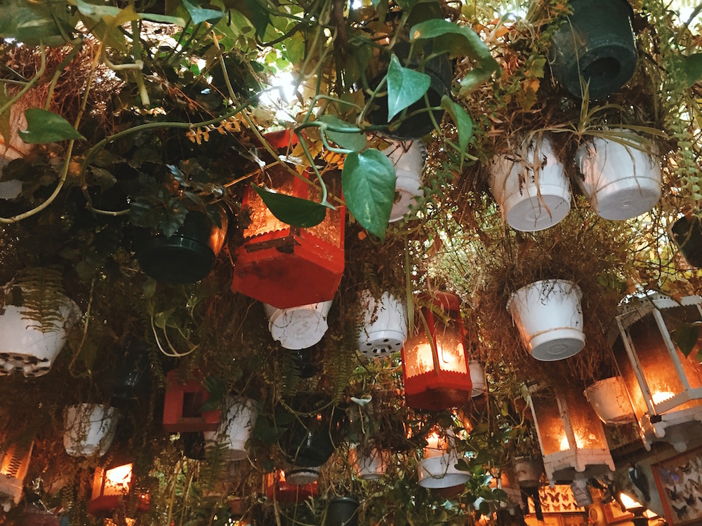 A Thai restaurant hidden out the back. Look at the ceiling covered in hanging plants.
