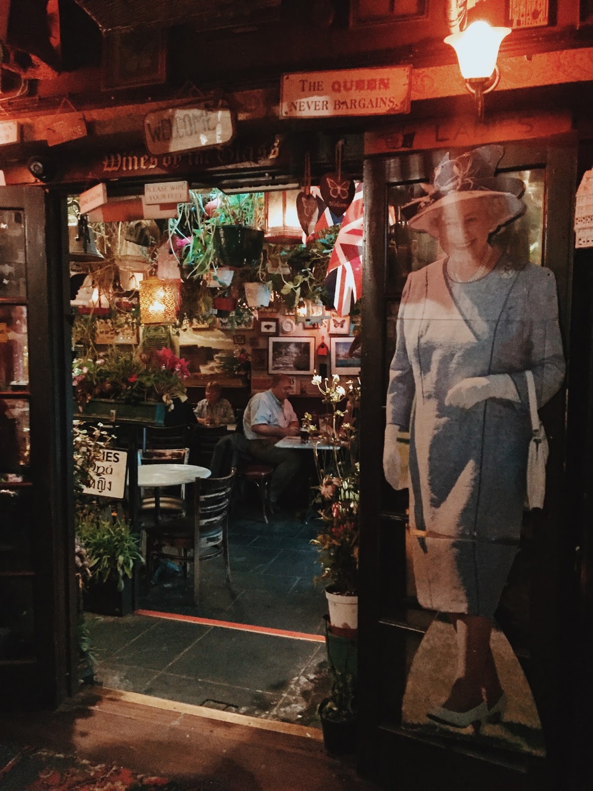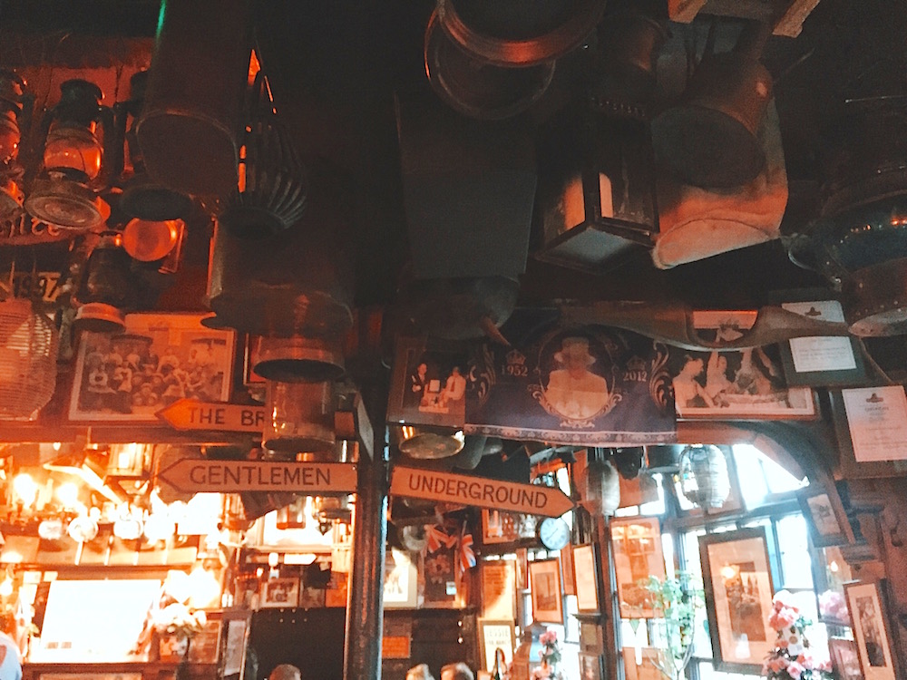 Step inside, and be prepared to have another ‘omg’ moment. It has all the traditional cherry wood furnishings but on the ceiling and walls, thousands of little British novelty objects and kitschy keepsakes are grabbing for your attention. I might have got a bit trigger happy inside too…