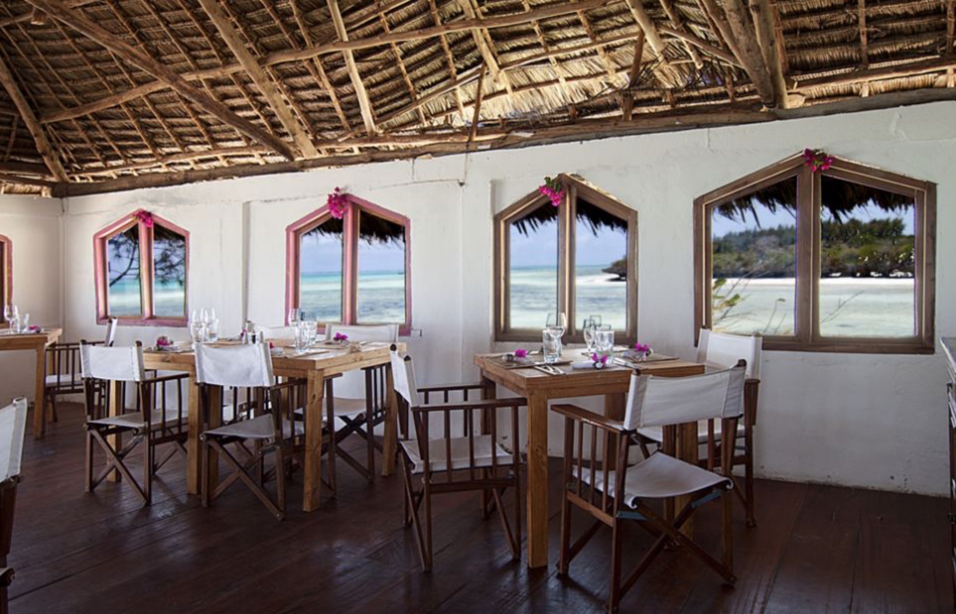 Paddle through the soft sandy clear warm water, up the wooden steps and inside you’ll find a breezy and relaxing dining room, decorated in a simple, unfussy local island style with tables set underneath windows for taking in the view.