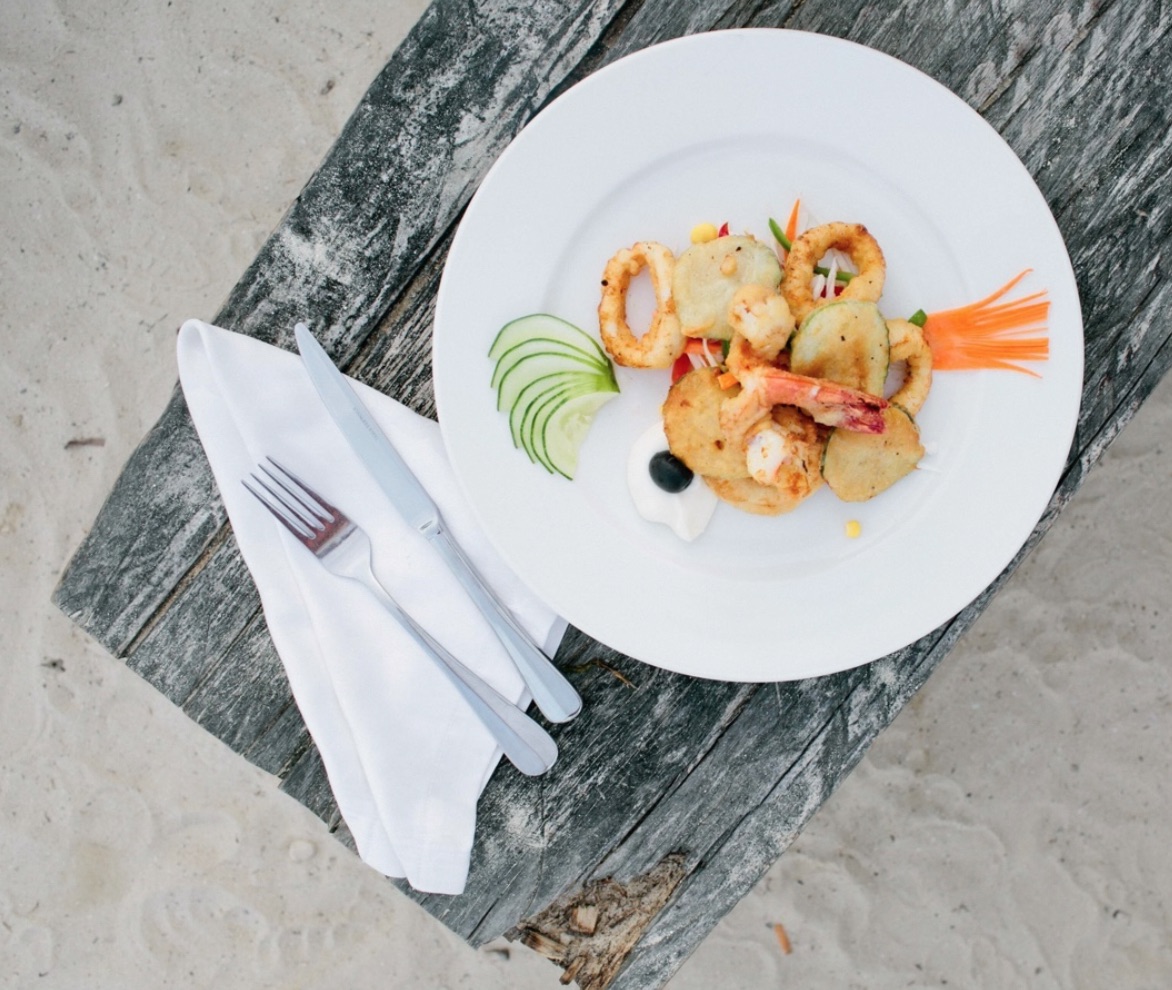 On the menu are lots of delicious local dishes made with fresh fish and seafood caught by the restaurant staff each day… including this pretty looking prawn, squid and zucchini tempura starter …