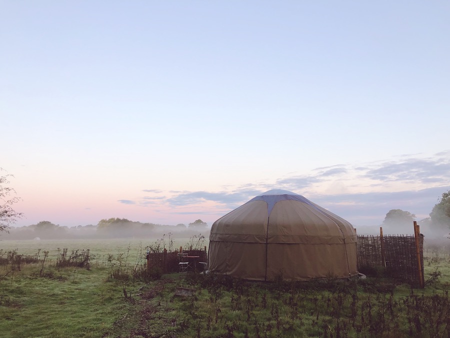 We make our way to our accommodation, an adventure in itself, along little paths, past a sweeping open meadow, a camp kitchen, shepherd’s huts and yurts.
