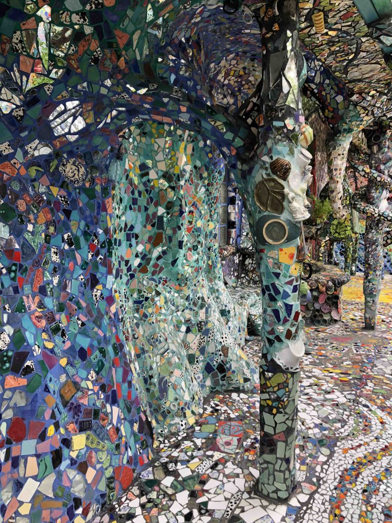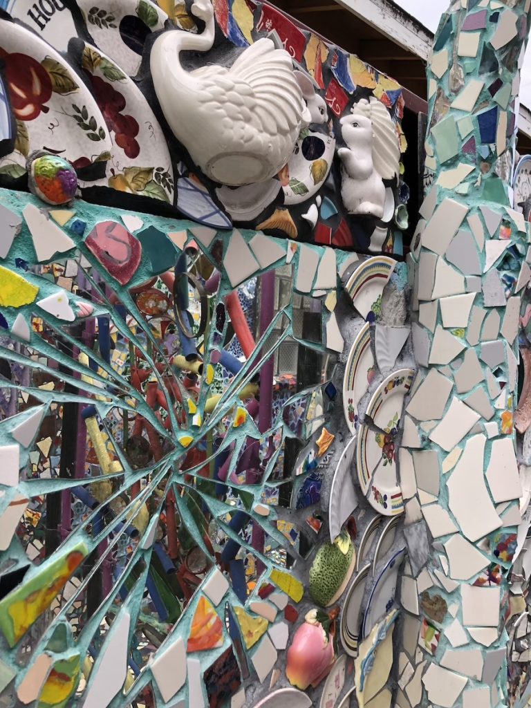 If he’s not there, he’ll likely be inside the house, working the gift shop, filled with clay and glass one-of-a-kind souvenirs for sale, each handmade by the couple. While here, look up and spot the mosaic tiles around the skylight.