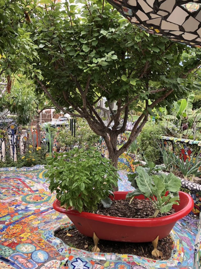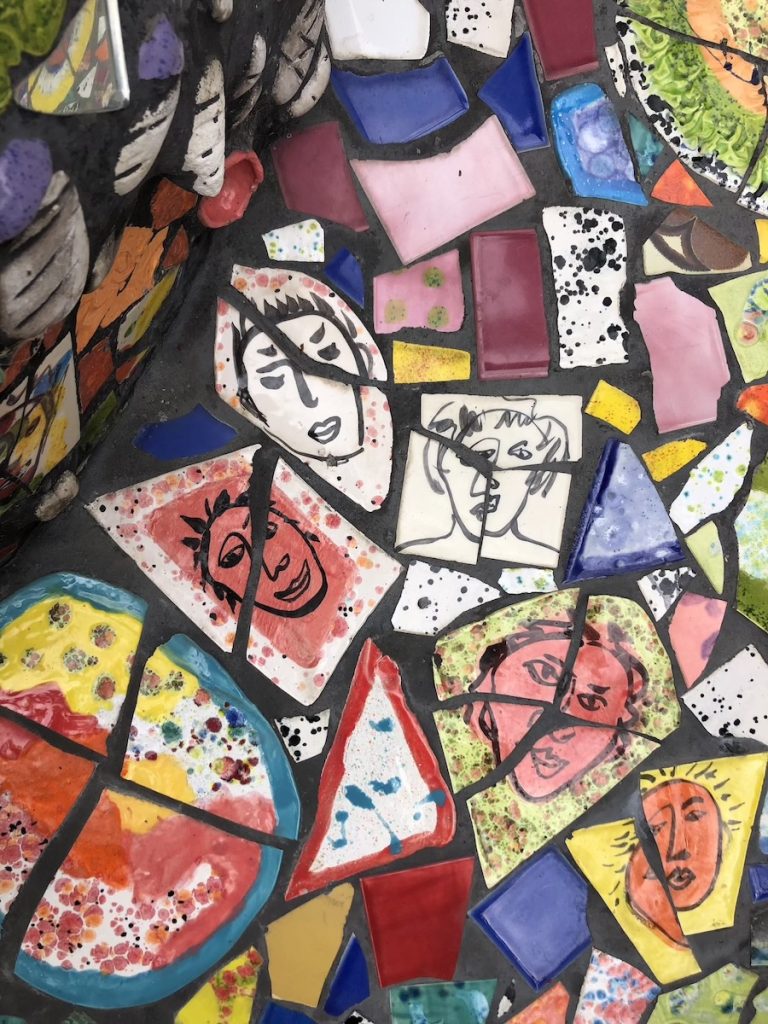Apparently, Cheri makes most of the tiles and creates the stained glass insets, while Gonzalo creates the forms, applies the mosaic tile and does the welding. Cheri also melts bottles and creates fused glass pieces to be used as mosaics. The best bit about a trip to this creative wonderland is taking your time to slow down and spot the details and all the individual little scenes this creation holds.